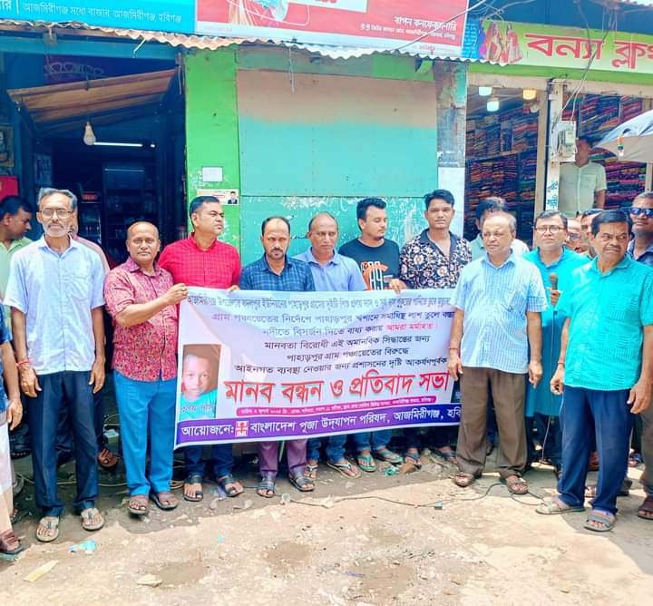এর প্রতিবাদে আজমিরীগঞ্জ পূজা উদযাপন পরিষদ শনিবার (৬ জুলাই) আজমিরীগঞ্জ রাধা গোবিন্দের জিউ-র আখড়ার সামনে জীবন কুমার চন্দের সভাপতিত্বে এক মানববন্ধন ও প্রতিবাদ সভা অনুষ্ঠিত হয়।উক্ত সভা পরিচালনা করেন আজমিরীগঞ্জ পূজা উদযাপন পরিষদের সাধারণ সম্পাদক বিপ্লব কুমার দেব।