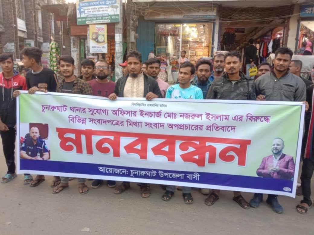 হবিগঞ্জের চুনারুঘাট থানার অফিসার ইনচার্জ মোঃ নজরুল ইসলামের বিরুদ্ধে বিভিন্ন সংবাদপত্রের মিথ্যা সংবাদ অপপ্রচারের প্রতিবাদে মানববন্ধন করা হয়েছে।