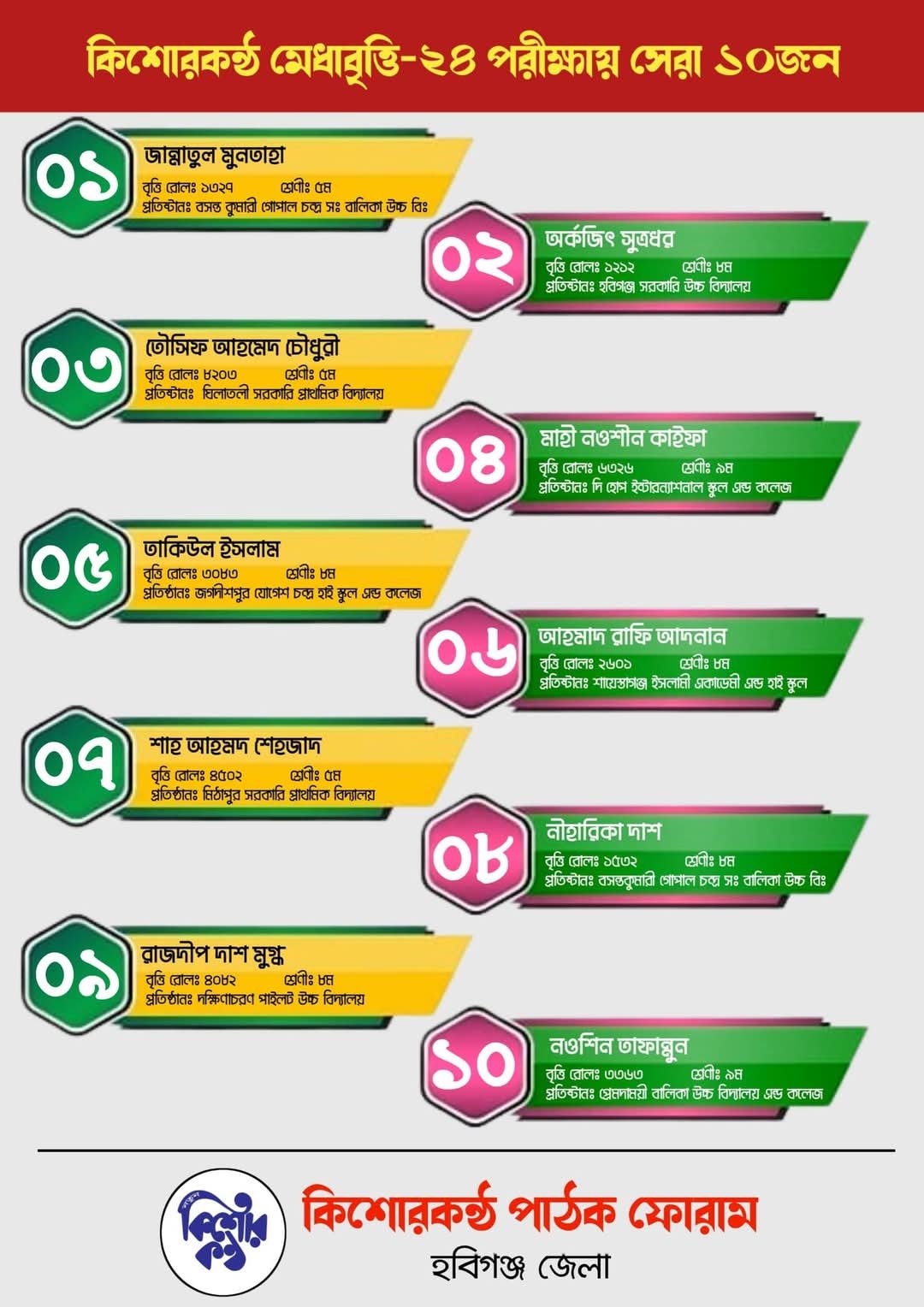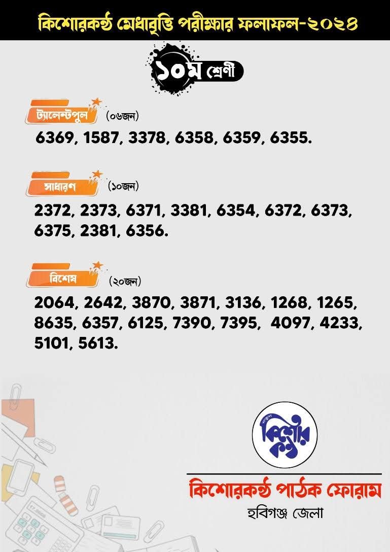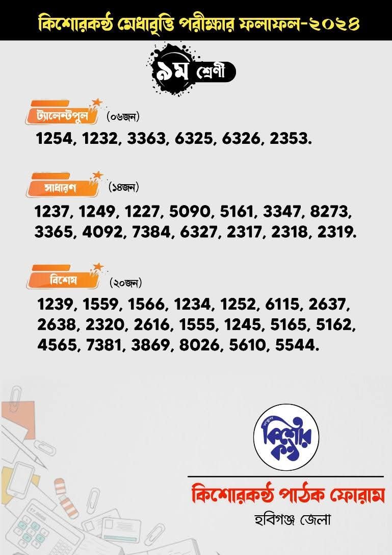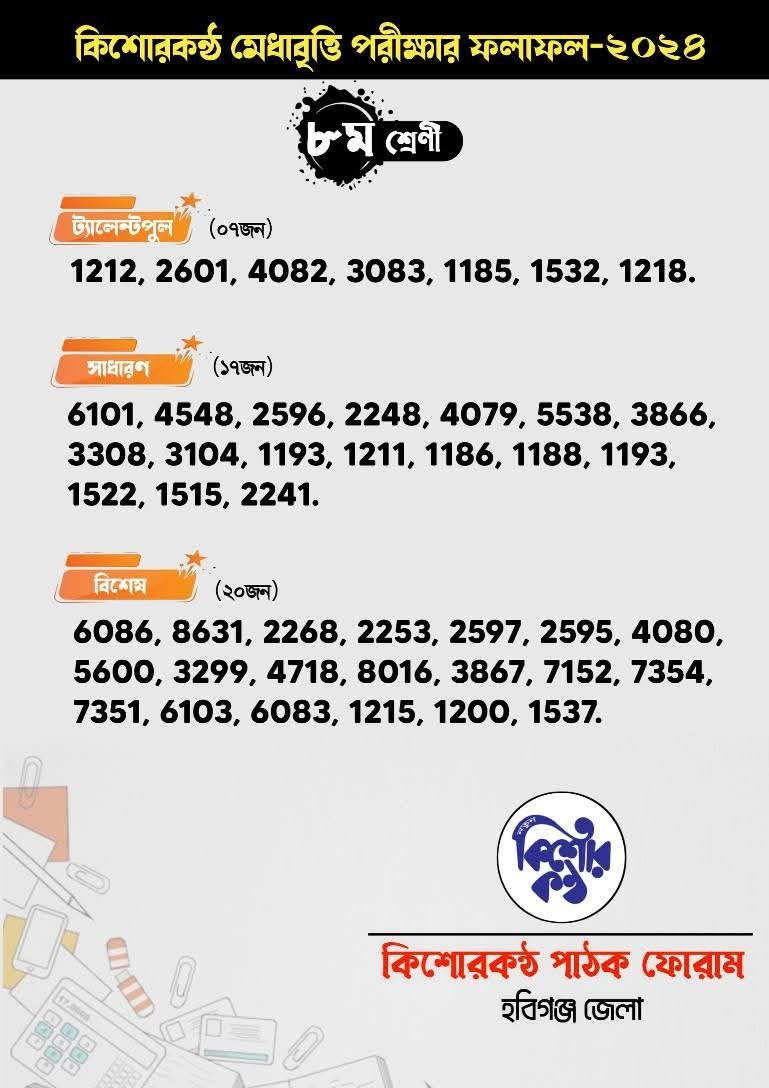 আজ রবিবার কিশোরকণ্ঠ পাঠক ফোরাম হবিগঞ্জ জেলা কর্তৃক আয়োজিত হবিগঞ্জের সর্ববৃহৎ বৃত্তি প্রকল্প ঐতিহ্যবাহী কিশোরকণ্ঠ মেধাবৃত্তি পরীক্ষা ২০২৪ এর ফলাফল হবিগঞ্জ জেলার একটি কনফারেন্স হলে সন্ধা ৬ ঘটিকায় প্রকাশ হয়েছে।