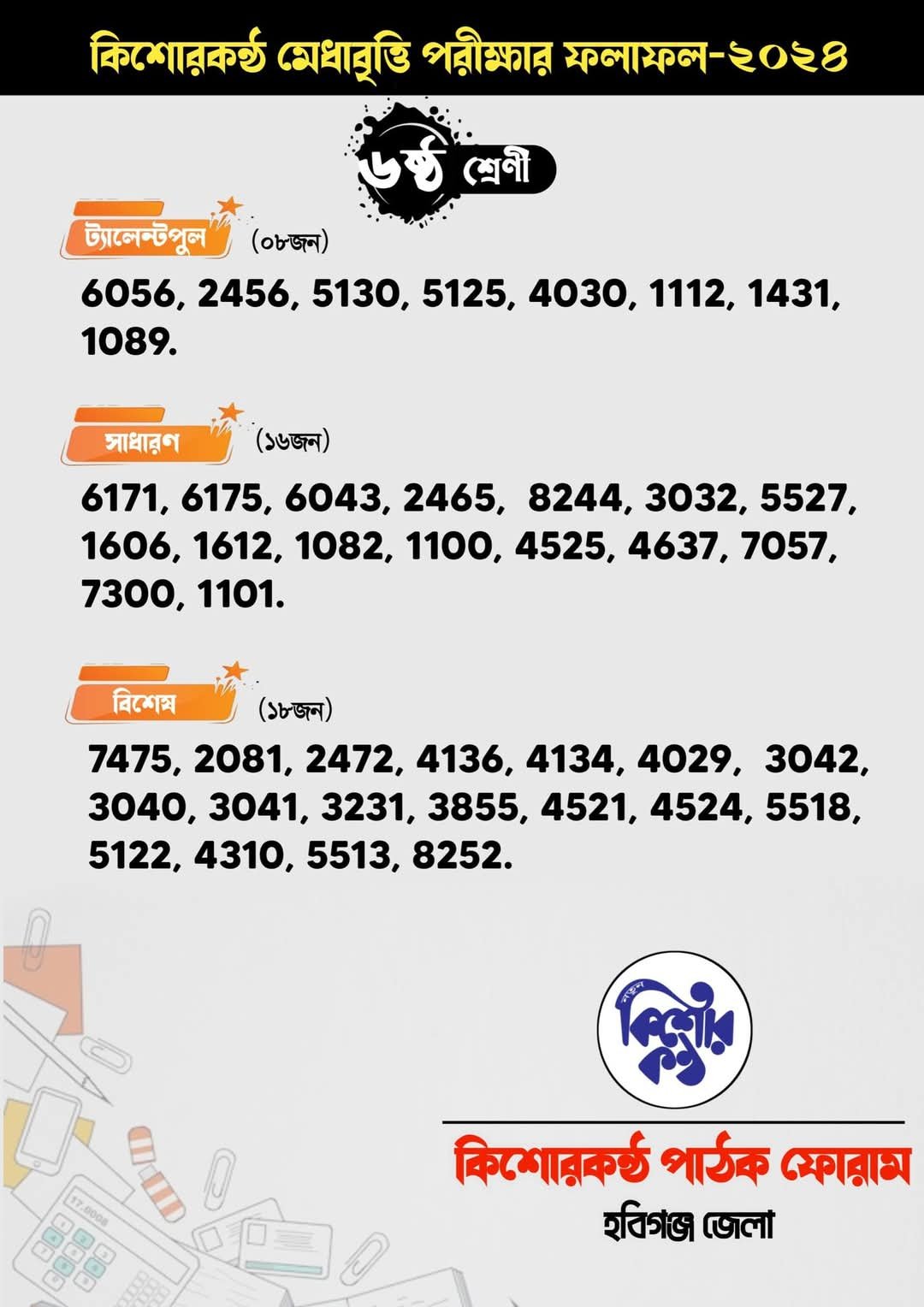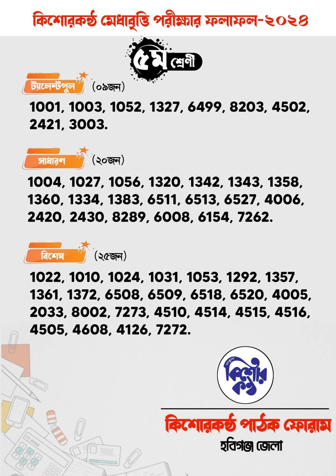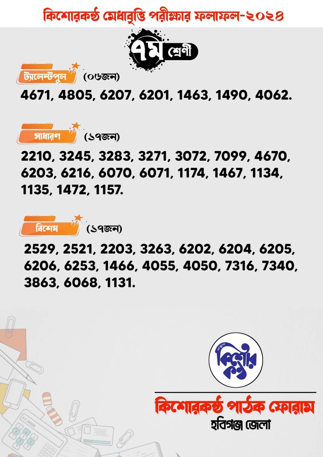 আজ রবিবার কিশোরকণ্ঠ পাঠক ফোরাম হবিগঞ্জ জেলা কর্তৃক আয়োজিত হবিগঞ্জের সর্ববৃহৎ বৃত্তি প্রকল্প ঐতিহ্যবাহী কিশোরকণ্ঠ মেধাবৃত্তি পরীক্ষা ২০২৪ এর ফলাফল হবিগঞ্জ জেলার একটি কনফারেন্স হলে সন্ধা ৬ ঘটিকায় প্রকাশ হয়েছে।