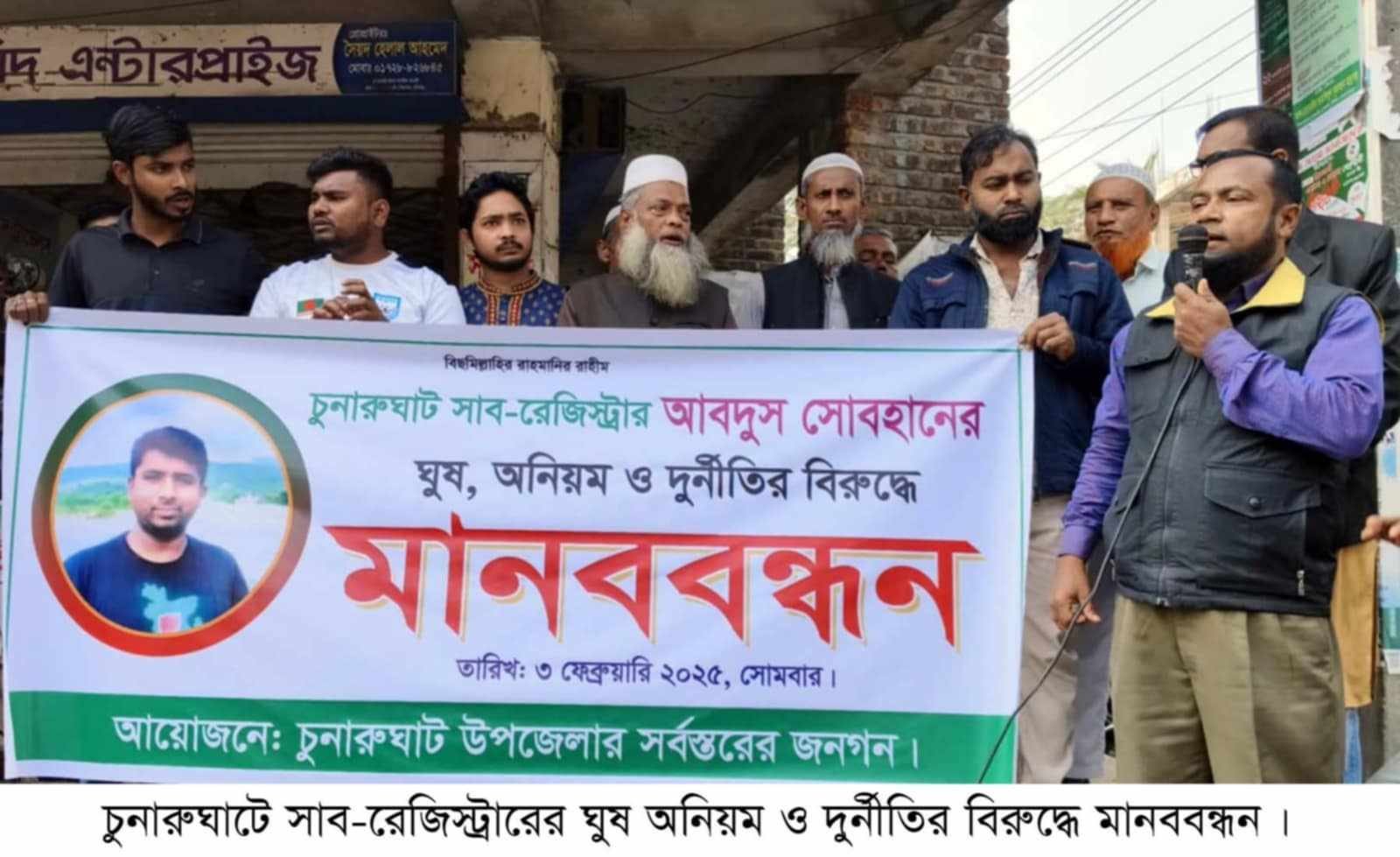 হবিগঞ্জের চুনারুঘাটে সাব-রেজিস্ট্রার আব্দুস সোবহানের বিরুদ্ধে ঘুষ, অনিয়ম ও দুর্নীতির অভিযোগে মানববন্ধন করেছে ভুক্তভোগী জনসাধারণ।