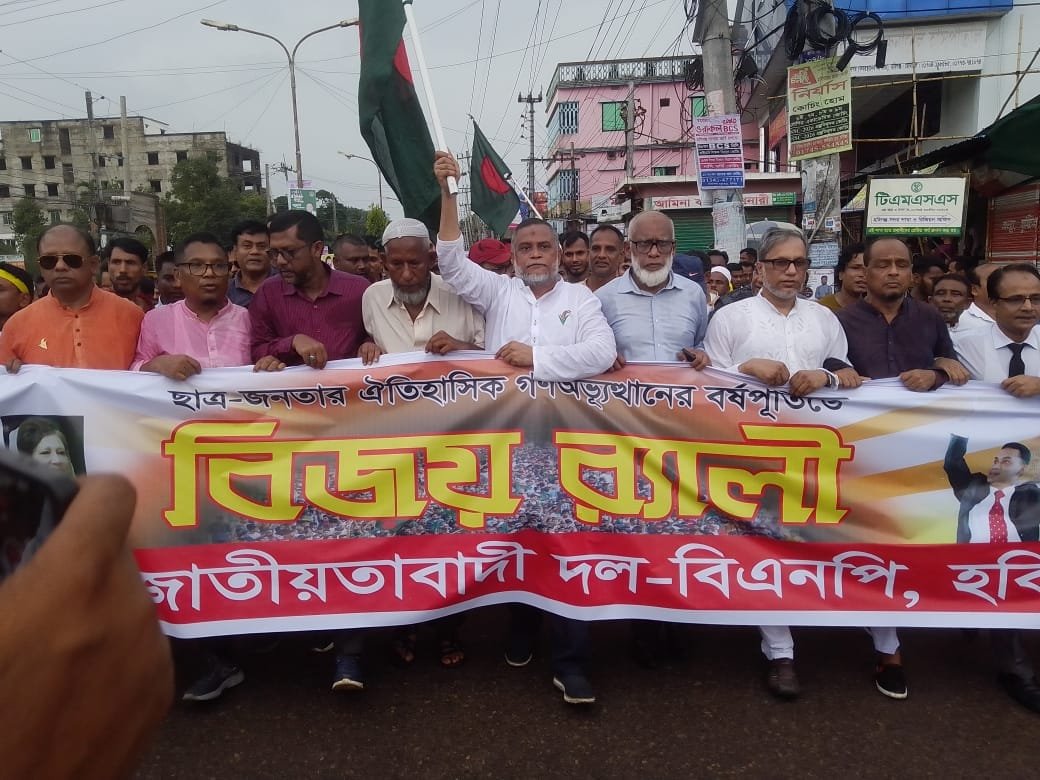 এর আগে জেলা বিএনপির বিজয় মিছিলে অংশগ্রহণের জেলা যুবদল, ছাত্রদল, ৯টি উপজেলা বিএনপি, ৬টি পৌরসভা বিএনপি ও এর অংঙ্গ সংগঠনের হাজার হাজার নেতাকর্মী আলাদা আলাদা মিছিল সহকারে হবিগঞ্জ কেন্দ্রীয় ঈদগা মাঠে উপস্থিত হন। মিছিলে মিছিলে উত্থাল হয়ে ওঠে গোটা হবিগঞ্জ শহর।