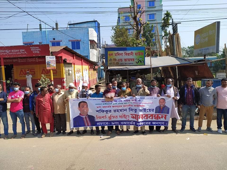 বিএনপির জাতীয় নিবার্হী কমিটির সমবায়ক বিষয়ক সম্পাদক ও হবিগঞ্জ পৌরসভার সাবেক মেয়র আলহাজ জিকে গউছ ও হবিগঞ্জ জেলা যুবদলের সিনিয়র যুগ্ম সাধারণ সম্পাদক পৌরসভার ৯নং ওয়ার্ড এর কাউন্সিলর সফিকুর রহমান সিতুর মুক্তির দাবীতে মানববন্ধন করেছেন এলাকাবাসী।