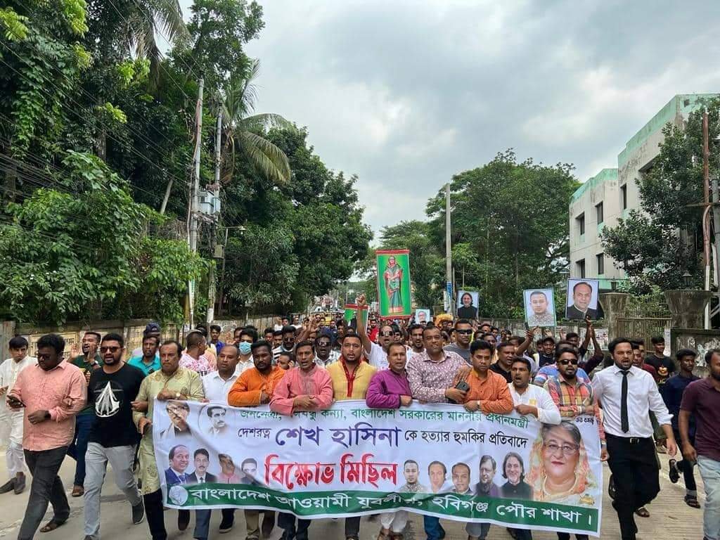 প্রধানমন্ত্রী শেখ হাসিনাকে হত্যার হুমকির প্রতিবাদে হবিগঞ্জে যুবলীগের উদ্দোগে বৃহস্পতিবার দুপুরে এক বিক্ষোভ মিছিল ও প্রতিবাদ সমাবেশ অনুষ্ঠিত হয়েছে৷ হবিগঞ্জ পৌর যুবলীগ এর আহবায়ক জেলা ছাত্রলীগের সাবেক সভাপতি ডাঃ ইশতিয়াক রাজ চৌধুরীর সভাপতিত্বে এবং ১ম যুগ্ম আহ্বায়ক ইকবাল হোসেন খান এর পরিচালনায় মিছিল ও সমাবেশে বক্তারা আগামী দিনে বিএনপি,জামায়াত এর যে কোন দেশ বিরোধী ষড়যন্ত্র মোকাবেলা কঠোরভাবে দমন করার অঙ্গীকার ব্যক্ত করেন।