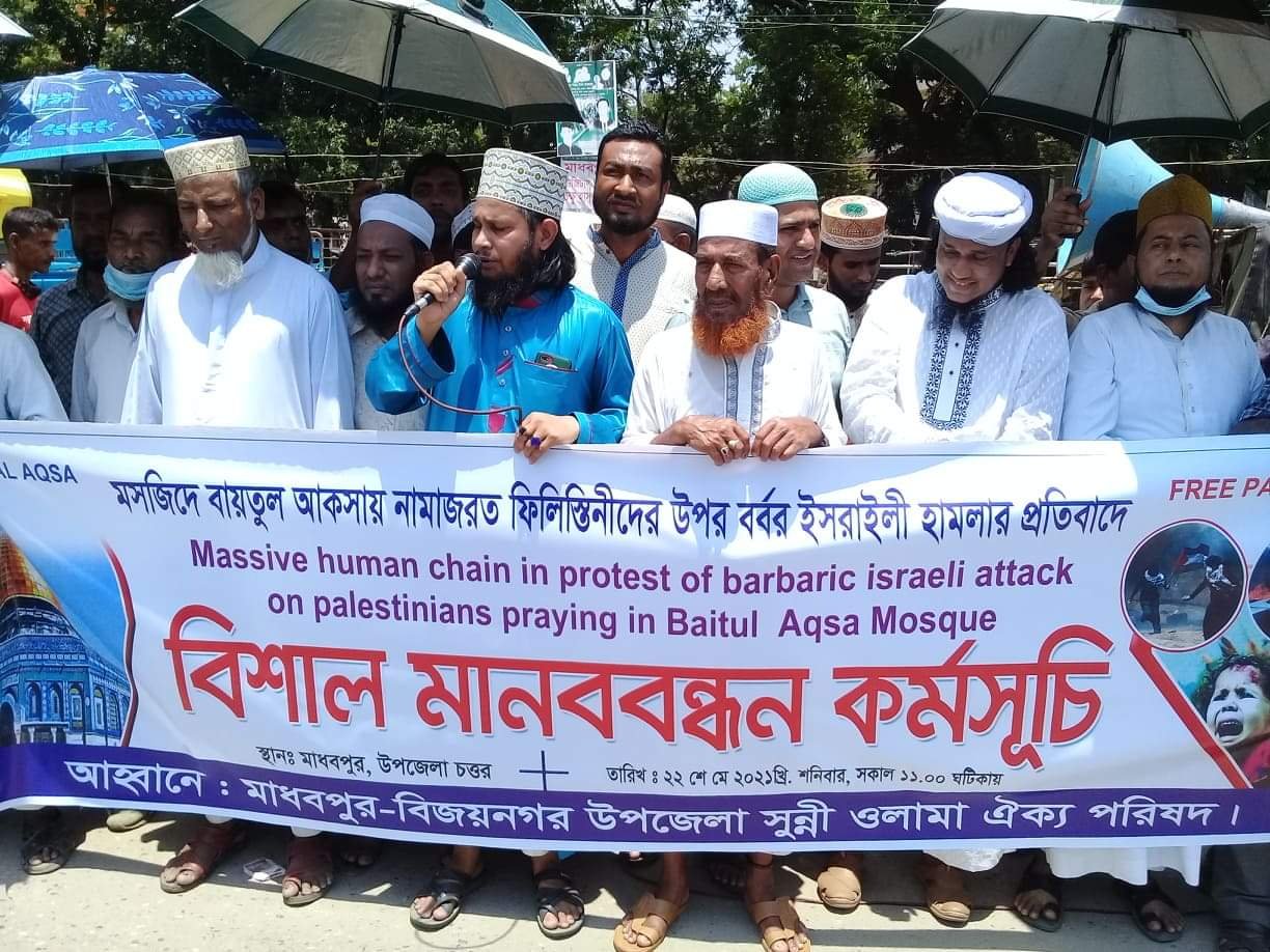 মসজিদে বায়তুল আকসায় নামাজরত ফিলিস্তিনিদের উপর বর্বর ইসরাইলের নগ্ন হামলার প্রতিবাদে মাধবপুর-বিজয়নগর আহলে সুন্নত ওয়াল জামায়াতের যৌথ উদ্যোগে মানববন্ধন কর্মসূচী অনুষ্ঠিত হয়েছে।