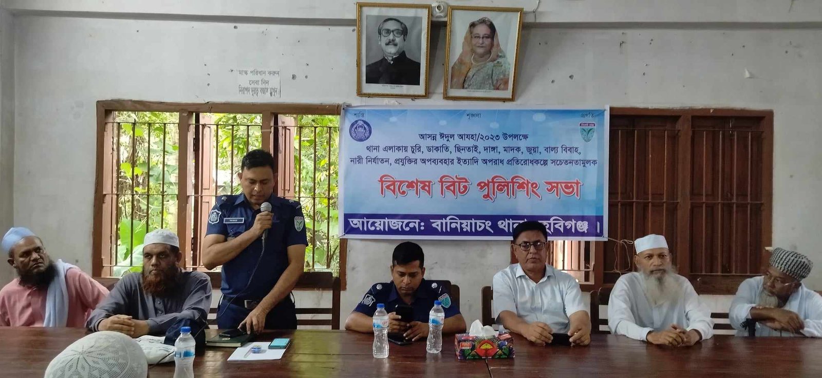 দিলোয়ার হোসাইন: হবিগঞ্জের বানিয়াচংয়ে আসন্ন ঈদুল আযহায় থানা এলাকায় চুরি.ডাকাতি,ছিনতাই,দাঙ্গা,জুয়া,বাল্য বিবাহ,নারী নির্যাতন,প্রযুক্তির অপব্যবহার ইত্যাদি অপরাধ প্রতিরোধকল্পে সচেতনমূলক বিশেষ বিট পুলিশিং সভা অনুষ্টিত হয়েছে।