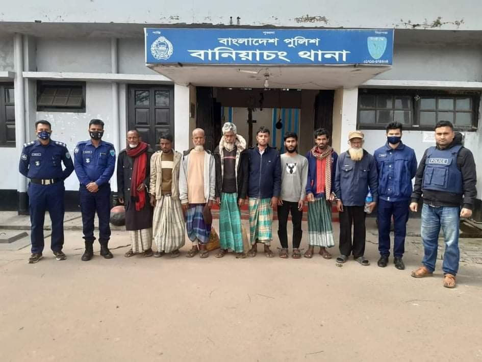 ৩ ফেব্রুয়ারি রাত্রিকালিন অভিযানে অফিসার ইনচার্জ মোহাম্মদ এমরান হোসেন’র দিক-নির্দেশনায় এসআই সবুজ কুমার নাইডু, এসআই দুলাল মিয়া, এসআই মনিরুল হক মুন্সী, এএসআই মহসিন মিজি, এএসআই হারুন অর রশিদ, এএসআই তোহা, এএসআই মোহাম্মদ সাদ্দাম হোসেনসহ সংগীয় ফোর্সের সহায়তায় অভিযান পরিচালনা করে মারামারি মামলায় ৫ বছরের সশ্রম কারাদন্ড ও দশ হাজার টাকা অর্থদন্ড সাজাপ্রাপ্ত আসামী ১। ছাত্ত মিয়া, পিতা- মৃত হিলাল উদ্দিন, গ্রাম নোয়াগাও। দুই বছরের সাজা প্রাপ্ত ও দশ হাজার টাকা অর্থদন্ড প্রাপ্ত আসামী ২। রমজান মিয়া (৪০) পিতা- মৃত হিলাল উদ্দিন, গ্রাম নোয়াগাও। এক বছরের সশ্রম কারাদন্ড ও দশ হাজার টাকা অর্থদন্ড প্রাপ্ত আসামী ৩। কামাল উদ্দিন (২৫) পিতা- ছাত্ত মিয়া, গ্রাম নোয়াগাও। চুরি মামলার পলাতক আসামী ৪। ইমরান হোসেন অরফে-ইমরান মিয়া/মহি উদ্দিন (২২) পিতা- ইলিয়াছ মিয়া, গ্রাম চান্দের মহল্লা। গ্রেফতারী পরোয়ানাভুক্ত পলাতক আসামী ৫। সেলিম মিয়া (৩২) পিতা- জহুর আলী, গ্রাম বাঘজুর। ৬। জহুর আলী (৫৫) পিতা- মৃত আব্দুল মিয়া, গ্রাম বাঘজুর। ৭। ফজর উদ্দিন (৫৫) পিতা- মৃত আলাউদ্দিন, গ্রাম উজিরপুর। ৮। মোঃ ছোলেমান, পিতা- মৃত আঃ মতলিব, গ্রাম শাহপুর খাগাউড়া বানিয়াচং।