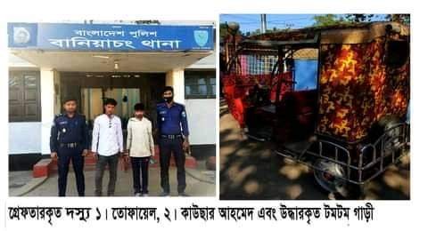 এই ঘটনার অভিযোগে বানিয়াচং থানা পুলিশ অভিযান চালিয়ে ছিনতাইকারী দুই কুখ্যাত চুর-ডাকাতকে গ্রেফতার করা হয় এবং তাদের কাছ ছিনতাইকৃত টমটমের যন্ত্রাংশ ও চালকের মোবাইল ফোন সেটটি উদ্ধার করা হয়।