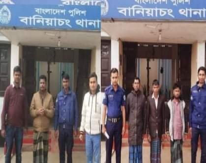 ২২ ডিসেম্বর দিবাগত রাতে বানিয়াচং থানার অফিসার ইনচার্জ মোঃ এমরান হোসেন এর দিক নির্দেশনায় অত্র থানায় কর্মরত এএসআই মোঃ তোহা, এএসআই মোহাম্মদ সাদ্দাম হোসেন, এএসআই চিত্ত রঞ্জন বিশ্বাস সংগীয় ফোর্সের সহায়তায় অভিযান পরিচালনা করিয়া চুরি মামলায় সাজাপ্রাপ্ত আসামী ১। মোঃ শিপন মিয়া, পিতা- ইব্রাহিম মিয়া, সাং- চতুরঙ্গরায়ের পাড়া, এবং গ্রেফতারী পরোয়ানাভুক্ত আসামী ২। আশিক মিয়া(২২), পিতা- মৃত সাওদ উল্লা, সাং- যাত্রাপাশা, ৩। আজিজ মিয়া(৩৪), পিতা- খাজা হোসেন, সাং- বাগহাতা, ৪। ইছাক আলী(৩১), পিতা- আছমত আলী, সাং- বাঘহাতা, সর্বথানা- বানিয়াচং, জেলা- হবিগঞ্জদের গ্রেফতার করা হয়। ২৩ ডিসেম্বর বৃহস্পতিবার আসামীদেরকে হবিগঞ্জ বিজ্ঞ আদালতে সোপর্দ করা হয়েছে।