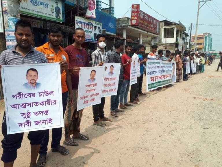 মিরপুর ইউপি চেয়ারম্যান সাইফুদ্দিনের গদত্যাগ চাই, প্রধানমন্ত্রীর উপহার ভেস্তে যেতে দেবোনা, বঙ্গবন্ধুর বাংলায় চাউল চোরের ঠাঁই নাই, চাউল চোর ও চাল আত্মসাতকারী চেয়ারম্যান সাইফুদ্দিন এর বিচারের দাবীসহ বিভিন্ন লেখাযুক্ত প্ল্যাকার্ড হাতে নিয়ে এলাকার ভুক্তভোগী জনগন রোজার মাঝে প্রখর রোদে দাড়িয়ে মানববন্ধন করেন।
