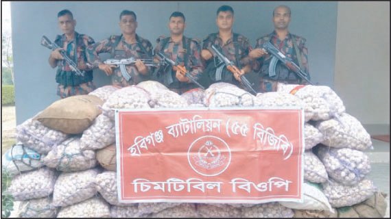 চুনারুঘাট উপজেলার নালুয়া চা-বাগান এলাকা থেকে ভারতে পাচারের সময় ৫শ কেজি রসুন জব্দ করেছে বর্ডার গার্ড বাংলাদেশ (বিজিবি)। শুক্রবার ভোরে বিজিবি চিমটিবিল বি.ও.পি’র নায়েক আব্দুল মান্নান এর নেতৃত্বে একদল জোয়ান এ অভিযান পরিচালা করে। এ বিষয়ে বিজিবি ৫৫ ব্যাটালিয়ান অধিনায়ক লে. কর্ণেল জাহিদুর রশীদ জানান, জব্দকৃত রসুনের মূল্য ৮০ হাজার টাকা। এ ব্যাপারে মামলা দায়ের করা হয়েছে। এছাড়াও সীমান্ত দিয়ে যে কোন ধরণের মালামাল পাচাররোধের তৎপর রয়েছে বিজিবি।