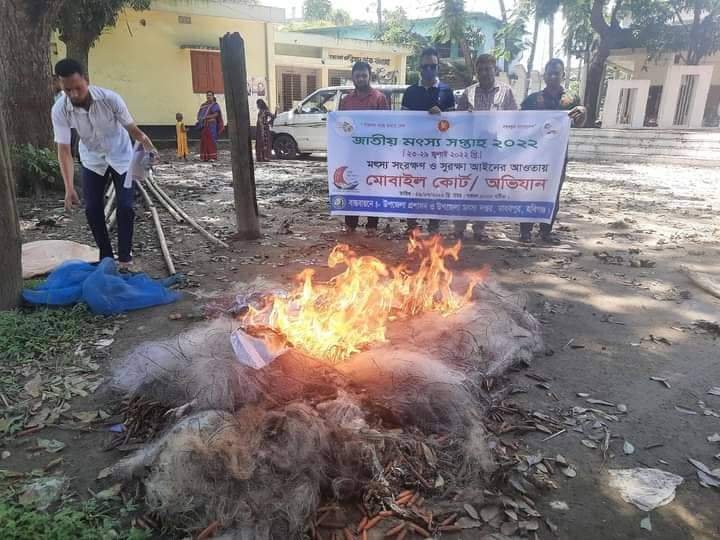 জাল গুলো পুড়ানোর সময় উপস্থিত ছিলেন উপজেলা নির্বাহী অফিসার শেখ মঈনুল ইসলাম মঈন,উপজেলা মৎস্য অফিসার কর্মচারীবৃন্দরা সহ জনসাধারণ।