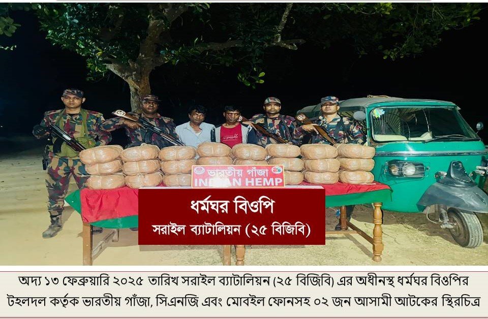 সরাইল ব্যাটালিয়ন (২৫ বিজিবি) এর সংবাদ বিজ্ঞপ্তি সূত্রে জানা যায়, মাধবপুর উপজেলার ধর্মঘর বিওপির একটি টহলদল দায়িত্বপূর্ণ সীমান্ত পিলার ১৯৯৪/এমপি হতে আনুমানিক ৮৫০ গজ বাংলাদেশের অভ্যন্তরে উপজেলার ধর্মঘর ইউনিয়নের দেবনগর নামক স্থান হতে দুই জন মাদক চোরাকারবারী বরিশাল জেলার গৌরনদী উপজেলার খানজাপুর গ্রামের শাহ আলম মৃধা এর ছেলে শামিম মৃধা (৩০) এবং মাধবপুর উপজেলার ধর্মঘর ইউনিয়নের মেহেরগাওঁ তোরাব আলীর ছেলে মোঃ শাহজাহান মিয়া (৪০)কে ভারতীয় ৫০ কেজি গাঁজা, সিএনজি ও মোবাইল ফোনসহ আটক করে। আটককৃত মাদকদ্রব্য, সিএনজি এবং মোবাইল ফোনের সিজার মূল্য ৬,৭৬,৫০০ (ছয় লক্ষ ছিয়াত্তর হাজার পাঁচশত) টাকা। আটককৃত আসামীদের পরবর্তী আইনানুগ ব্যবস্থা গ্রহণের নিমিত্তে মাদকদ্রব্য, সিএনজি, এবং মোবইল ফোনসহ মাধবপুর থানায় মামলা দায়ের করতঃ হস্তান্তরের কার্যক্রম প্রক্রিয়াধীন রয়েছে।