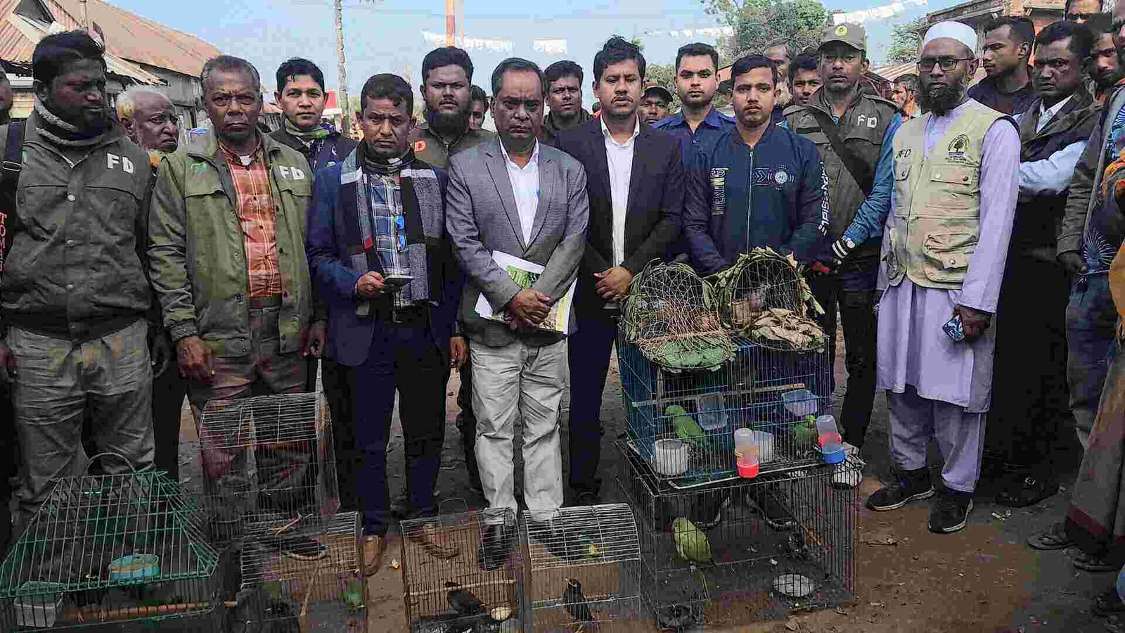 এসময় ২ টি তিলা ঘুঘু, ৪ টি শালিক, ৩টি দেশী টিয়া,১টি চন্দনা টিয়া,১ টি ডাহুক,১টি দেশী ময়নাসহ এবং পাখি শিকারের অসংখ্য ফাঁদ ও খাঁচা জব্দ করা হয়।