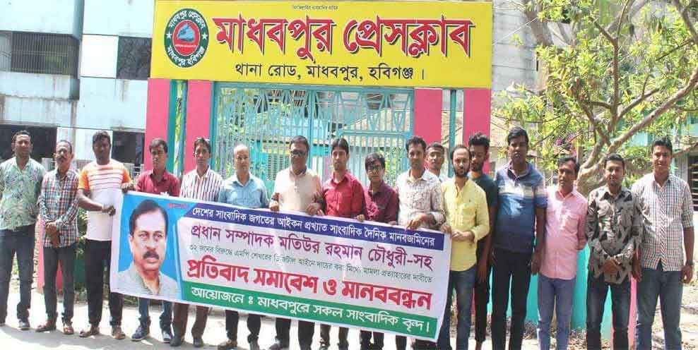 বুধবার সকালে মাধবপুর প্রেসক্লাবের সামনে প্রায় ১ ঘন্টা ব্যাপি মানববন্ধন শেষে সাংবাদিক রাজীব দেব রায় রাজু সঞ্চালনায় অনুষ্টিত প্রতিবাদ সভায় বক্তব্য রাখেন দৈনিক যুগান্তর প্রতিনিধি রোকন উদ্দিন লষ্কর, সমকাল প্রতিনিধি মোঃ আইয়ুব খান, বাংলাদেশের খবর প্রতিনিধি সানাউল হক চৌধুরী শামীম, আমাদের সময় প্রতিনিধি মোহা. অলিদ মিয়া, আমাদের নতুন সময় প্রতিনিধি বিকাশ রঞ্জন বীর, নয়া দিগন্ত প্রতিনিধি আবুল খায়ের, দৈনিক আয়না প্রতিনিধি বিল্লাল হোসেন খানঁ, জনকন্ঠ প্রতিনিধি শংকর পাল চৌধুরী, বাংলা টিভি প্রতিনিধি হামিদুর রহমান, সাপ্তাহিক তথ্য বিচিত্রা প্রতিনিধি সৈয়দ শাহরুল ইসলাম সুমন, আমার সংবাদ প্রতিনিধি আলমগীর কবির, দৈনিক বিজয়ের কন্ঠ প্রতিনিধি সুব্রত দেব , দৈনিক প্রভাকর প্রতিনিধি দুলাল সিদ্দিকী, অনলাইন নিউজ পোর্টাল নিউজ ভ্যানগার্ড বাংলাদেশ প্রতিনিধি আনিসুর রহমান মুক্তার, বিডি লাইভ টিভি প্রতিনিধি জাকির হোসেন, বিজয়ের প্রতিধ্বনি প্রতিনিধি লিটন পাঠান প্রমুখ।