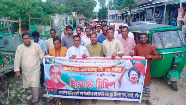 বিল্লাল আহমেদ: বিএনপির চেয়ারপার্সন তিনবারের সাবেক প্রধানমন্ত্রী বেগম খালেদা জিয়ার নিঃশর্ত মুক্তি ও বিএনপির কেন্দ্রীয় নির্বাহী কমিটির সমবায় বিষয়ক সম্পাদক হবিগঞ্জ পৌরসভার পদত্যাগ কারী সফল মেয়র আলহাজ্ব জি কে গউছ এর মুক্তি দাবিতে হবিগঞ্জে লাখাই উপজেলার ৬নং বুল্লা ইউনিয়ন বিএনপির উদ্যোগে বিক্ষোভ মিছিল ও সমাবেশ অনুষ্ঠিত হবে হয়।