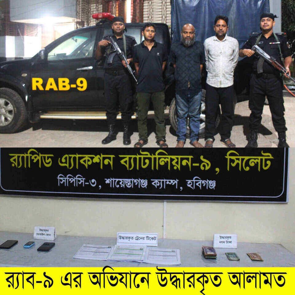 হবিগঞ্জে র‌্যাব-৯ এর অভিযানে বিপুল পরিমাণ ট্রেনের টিকেটসহ কালোবাজারি চক্রের ০৩ জন সদস্য গ্রেফতার।