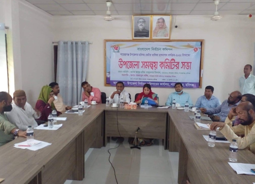 হবিগঞ্জের শায়েস্তাগঞ্জ উপজেলায় ছবিসহ ভোটার তালিকা হালনাগাদ কার্যক্রম-২০২২ উপলক্ষে উপজেলা পরিষদে সমন্বয় কমিটির সভা অনুষ্ঠিত হয়েছে। রোববার (৩ জুলাই) দুপুরে উপজেলা পরিষদ সভা কক্ষে উপজেলা নির্বাচন অফিসের আয়োজনে এবং উপজেলা নির্বাহী অফিসার (ইউ এন ও) নাজরাতুন নাঈম এর সভাপতিত্বে ও উপজেলা নির্বাচন অফিসার মনিরুজ্জামানের পরিচালনায় প্রধান অতিথি হিসেবে বক্তব্য রাখেন মোঃ আব্দুর রশিদ তালুকদার ইকবাল।