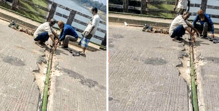 সেতুতে বাঁশ দিয়ে সংস্কার কাজে নিয়োজিত শ্রমিকরা জানান, এ সেতু দিয়ে অতিরিক্ত ভারি বালু ও পাথরবাহী ট্রাক চলাচল করায় সেতুর জোড়া থেকে স্টিলের পাত উঠে গিয়ে ফাঁক হয়ে গেছে। স্টিলের পাত চুরি হয়ে যাওয়ায় পাটাতনের ফাঁকা জায়গায় বিটুমিন দিয়ে ভরাট করার জন্য স্টিলের পরিবর্তে বাঁশের ব্যবহার করা হয়েছে।