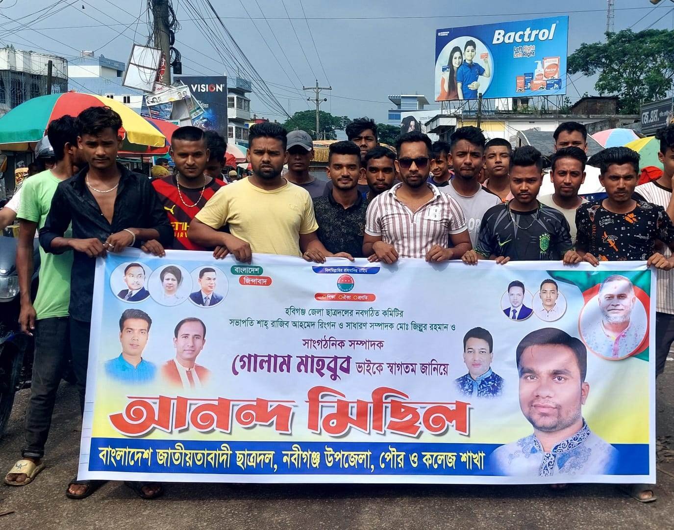 নবীগঞ্জ উপজেলা ছাত্রদলের সভাপতি প্রত্যাশী নাবেদ মিয়ার নেতৃত্বে আনন্দ মিছিলটি অনুষ্ঠিত হয়।