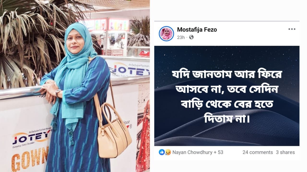 রবিবার(৫ অগাস্ট) ওই শিক্ষিকা তার মৃত স্বামীকে উদ্দেশ্য করে তার ভেরিফাইড ফেইসবুক আইডি থেকে পোস্ট করেন,”যদি জানতাম আর ফিরে আসবে না, তবে সেদিন বাড়ি থেকে বের হতে দিতাম না।”