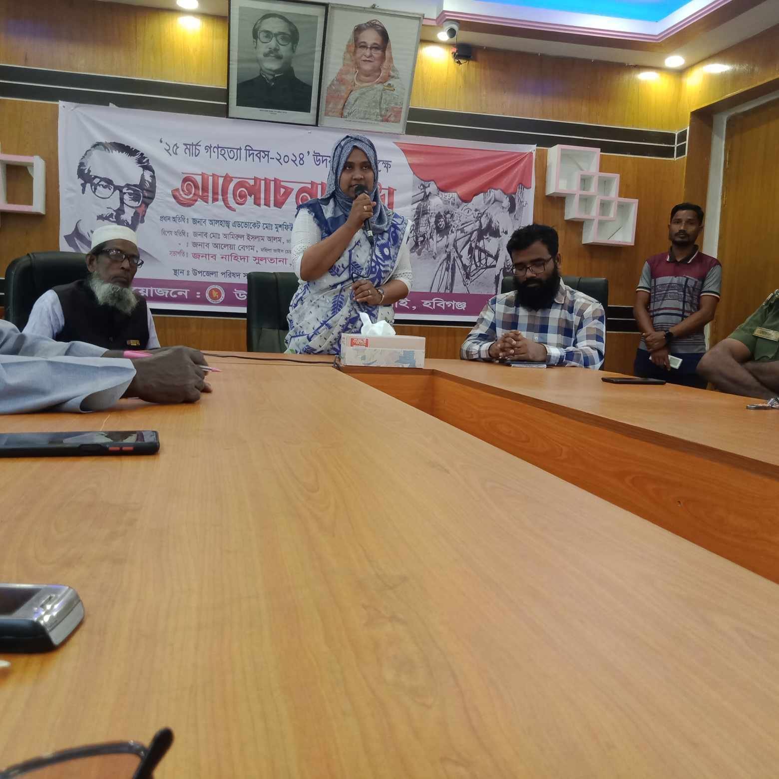 বিল্লাল আহমেদ: ২৫ মার্চ গণহত্যা দিবস-২০২৪ উদযাপন উপলক্ষে উপজেলা প্রশাসন এর আয়োজনে আয়োজিত আলোচনা সভা উপজেলা পরিষদ সভাকক্ষে উপজেলা নির্বাহী কর্মকর্তা ( ইউএনও) নাহিদা সুলতানা এর সভাপতিত্বে অনুষ্ঠিত হয়।